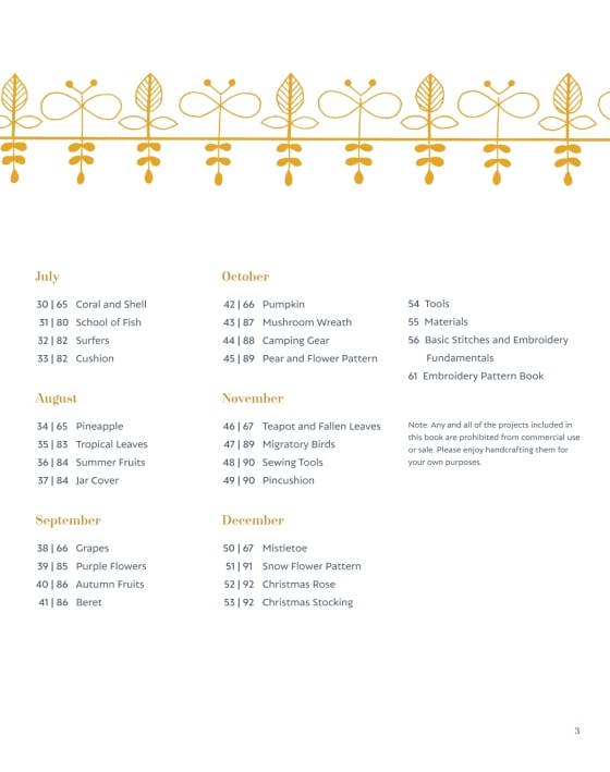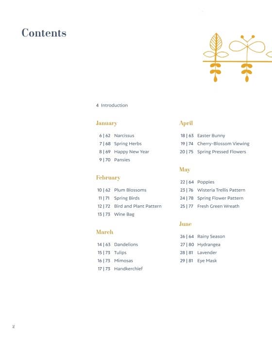 ​​With 56 unique embroidery pieces to reflect the seasons, this next book from beloved author Yumiko Higuchi takes creatives on a month-by-month exploration of colorful motifs that can be used on a variety of fabrics and surfaces. Each month starts with an emblem of the month number, such as a vibrant poppy wreath for May, a viny pumpkin for October, and sprigs of mistletoe and Christmas roses for December. Each emblem perfectly captures the spirit of the month, and the subsequent patterns for each month follow the seasonal theme. ​Each design in the book is accompanied by step-by-step instructions for recreating it, including stitch types, thread colors by number, and thread type. There is also a detailed section on how to perform certain stitches and knots to guide beginners. Whether embroidering a new dress, a pillowcase, a bag, or even a jar cover for jam, Stitching through the Seasons has charming patterns that are sure to spark creativity and festivity for embroiderers both experienced and just starti